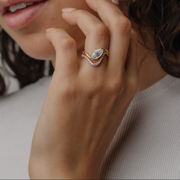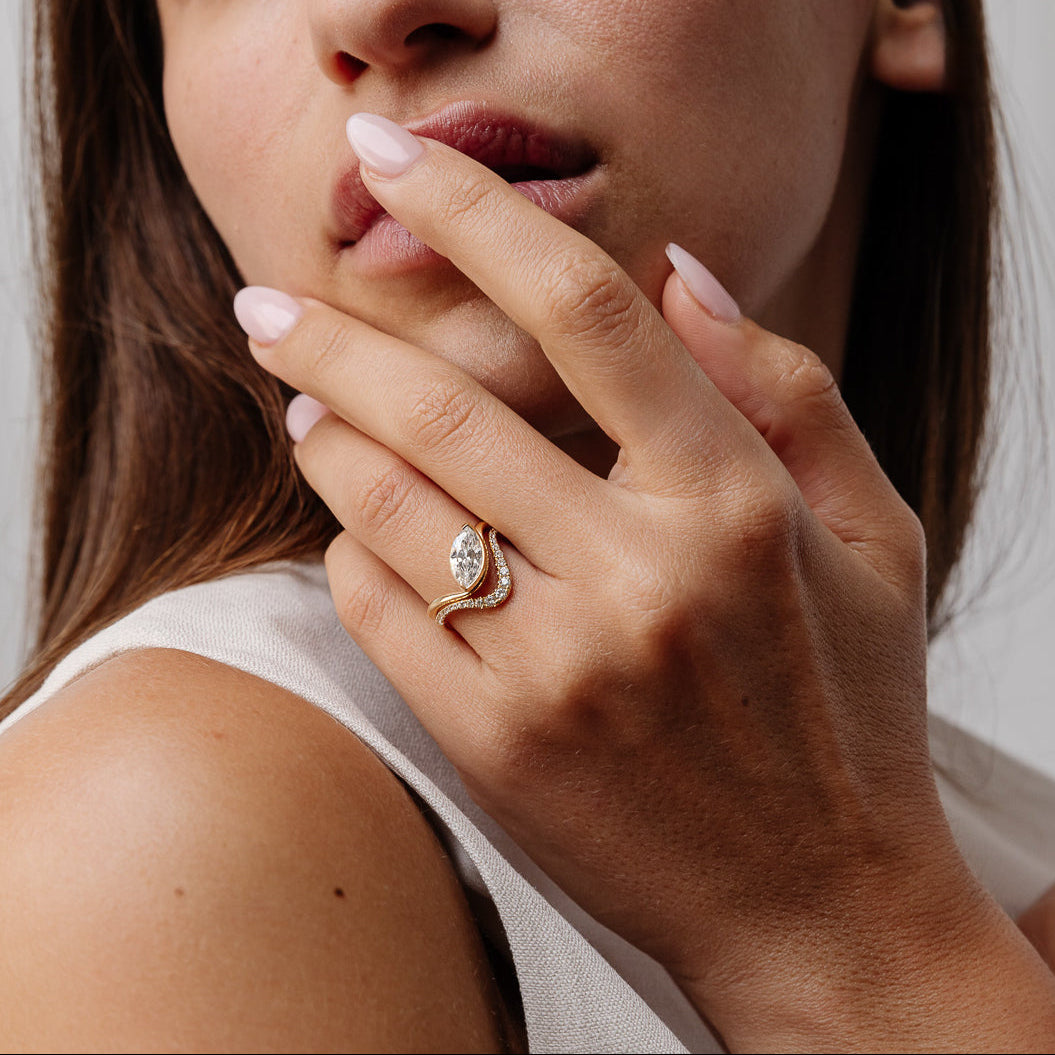 At the heart of this ring lies a breathtaking 1.14 CT Marquise-shaped lab-grown diamond, ethically grown for exceptional brilliance and purity. The IGI-certified center stone is available in elite grades including D/VVS2, EF/VVS1, EF/VS1, and G/VS1, offering a flawless, inclusion-free sparkle.