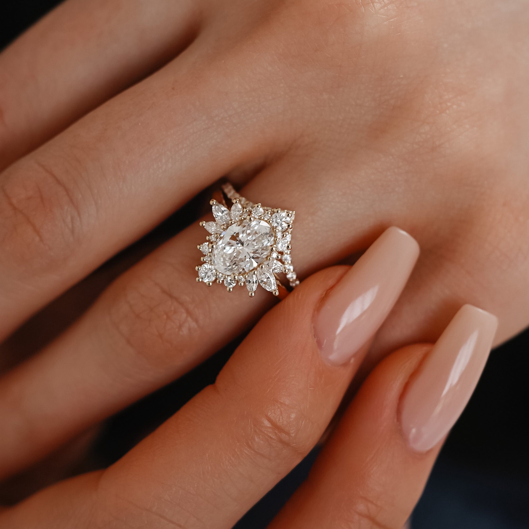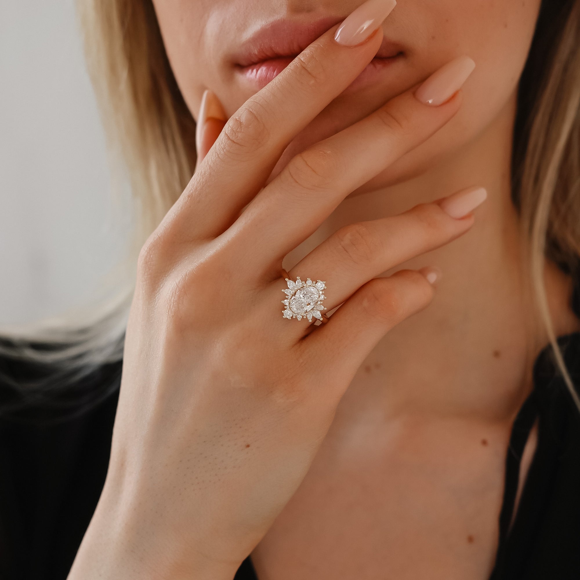Enhancing the centerpiece are marquise & round lab-grown diamond side stones totaling 0.52 TCW. Selected in DEF color and VS clarity, these delicate accents add a graceful shimmer that elevates the ring’s overall radiance.